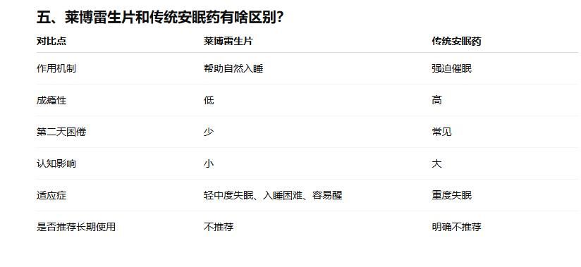 所以如果你有入睡慢、容易醒、睡眠不深的问题,莱博雷生片可能会是一个更合适的选择。