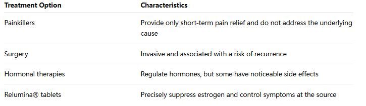 Relumina® tablets improve pain caused by endometriosis by suppressing estrogen secretion at its source, providing a systematic management approach.