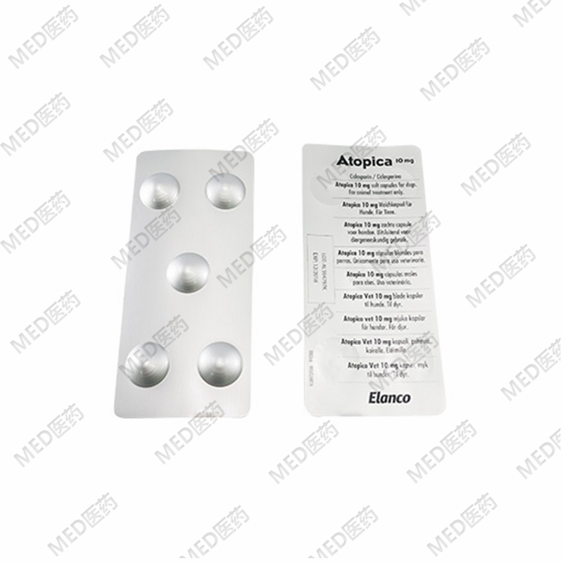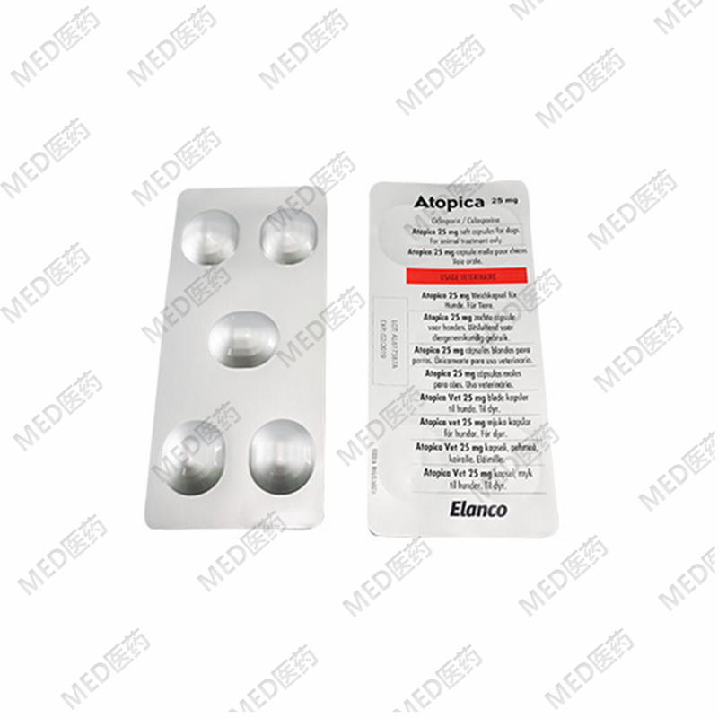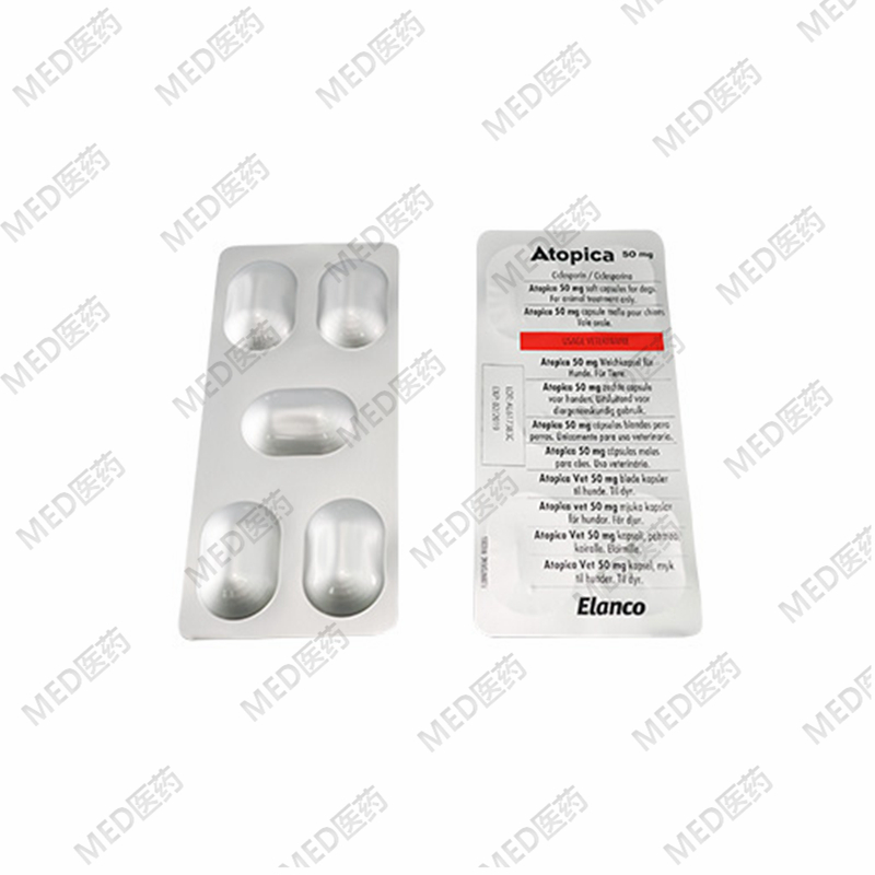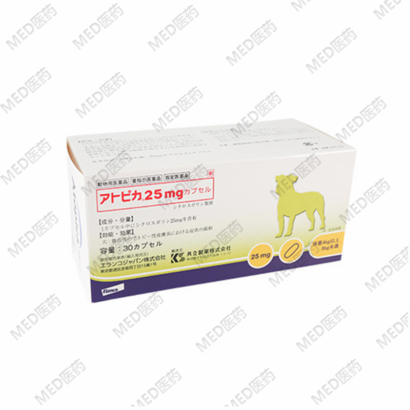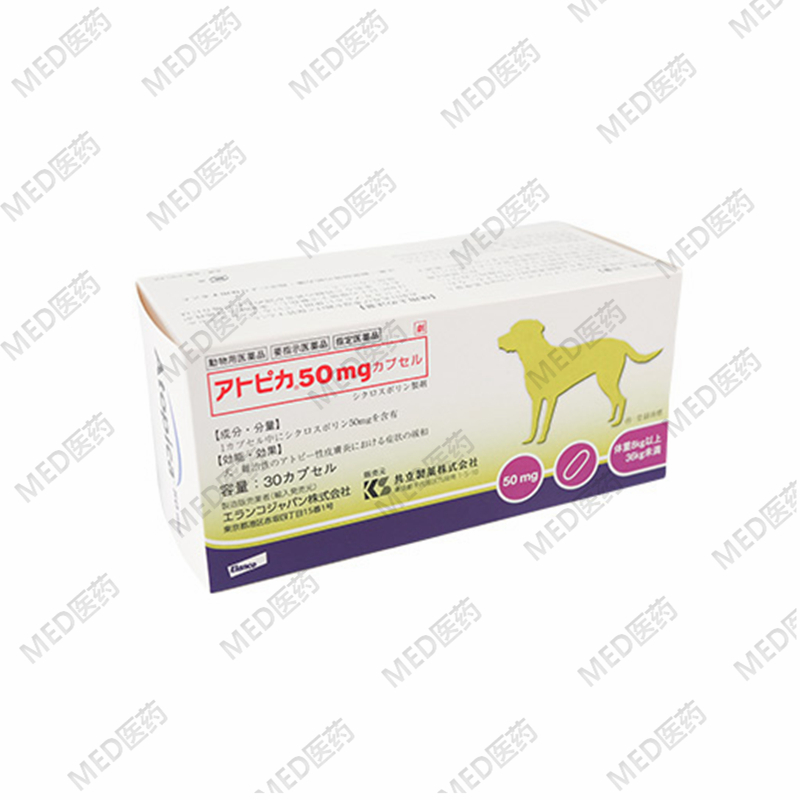 一种以环孢素为有效成分的免疫抑制剂,由瑞士的诺华动物健康公司开发。环孢素是一种由真菌Tolypocladium inflatum gams的培养液中提取的由11个氨基酸组成的疏水性环状多肽,特异性且可逆地作用于T淋巴细胞等。アトピカ是环孢素的微乳前浓缩物制剂,能够在体内轻松形成混合胶束,表现出与水溶性相似的特性,因此胆汁酸分泌量和饮食对吸收率的影响较小,能够实现快速且稳定的吸收