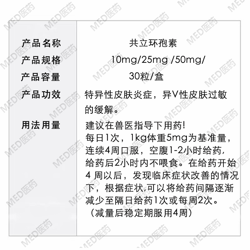 以下量连续 4 周口服给药,以每公斤体重 5 毫克环孢菌素为参考量,每天一次。 本药应在进食后至少2小时空腹给药,给药后2小时内不宜进食。 如果在给药开始 4 周后观察到临床症状改善,则根据症状,剂量之间的间隔可能会逐渐减少到每隔一天或每周两次。 服用该药物时,应定期进行医学检查,并应至少每 8 周检查一次继续使用的利弊。