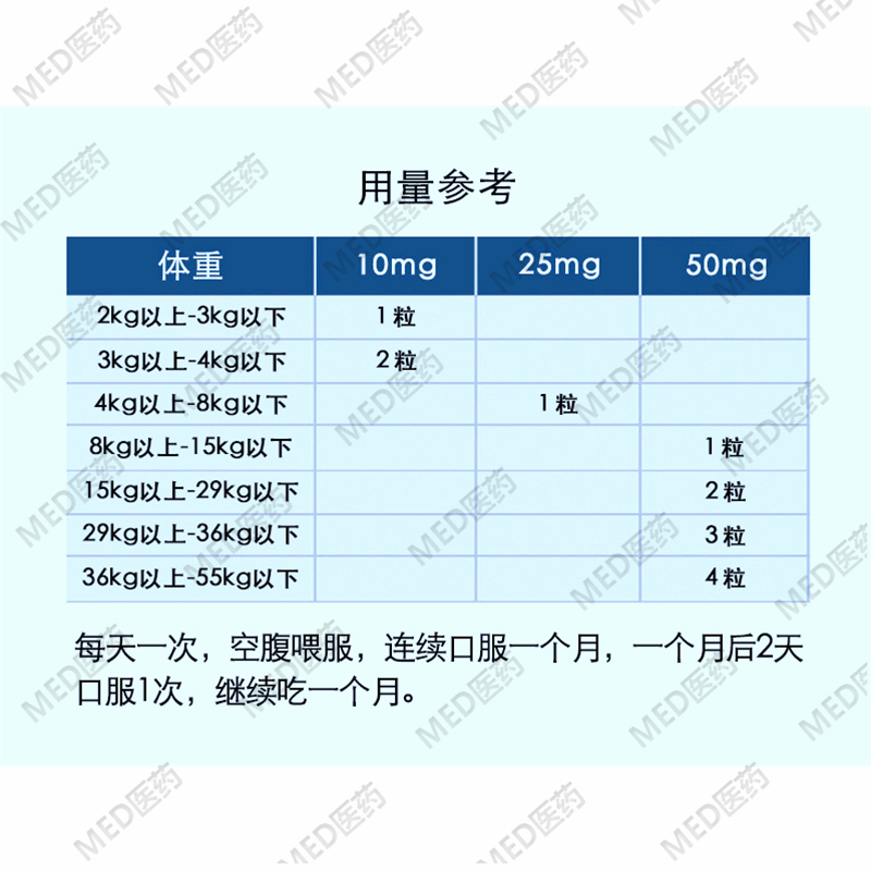 体重 8 公斤或以上且小于 15 公斤:1 粒 50 毫克胶囊