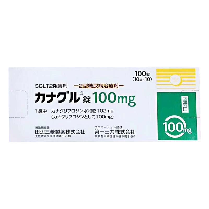 1錠中:カナグリフロジン水和物 102mg(カナグリフロジンとして 100mg) 添加物としてD-マンニトール、ヒドロキシプロピルセルロース、クロスカルメロースナトリウム、フマル酸ステアリルナトリウム、タルク、ポリビニルアルコール(部分けん化物)、マクロゴール4000、酸化チタン、黄色三二酸化鉄、三二酸化鉄を含有する。