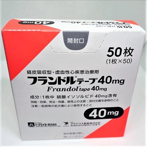 日本消心痛 硝酸异山梨酯 心绞痛、心肌梗塞、冠心病、充血性心力衰竭、供血不足、虚心性心脏疾患 Frandol硝酸异山梨酯贴片40mg:50枚