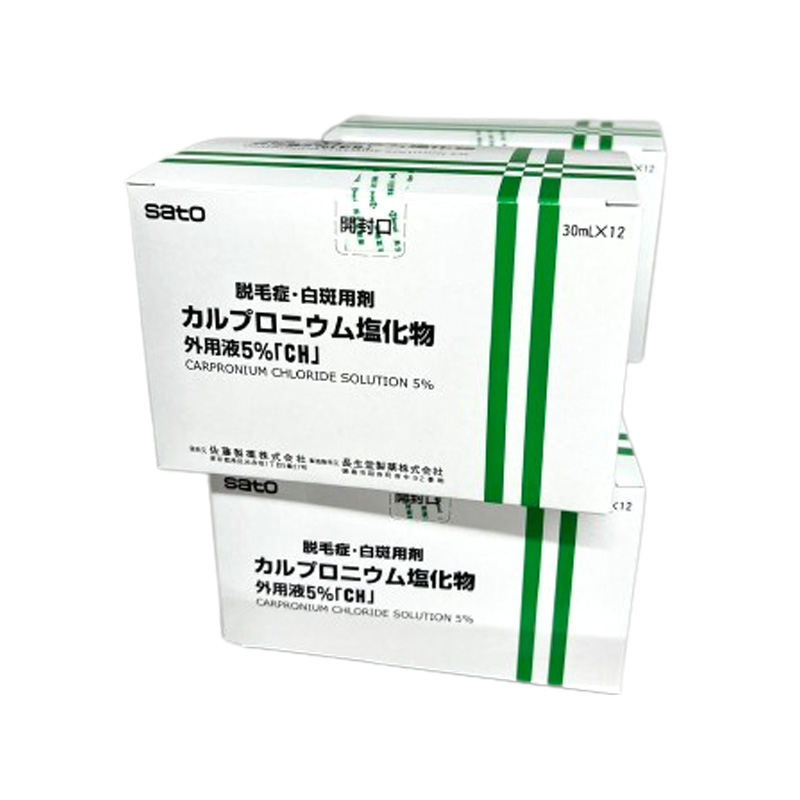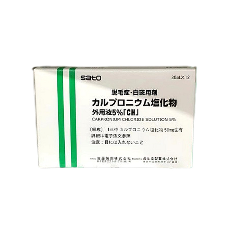 ※必ず能書をご確認ください。 局所血管拡張作用と皮膚浸透性、発毛促進作用によって、機能低下状態の毛のうの活性を高め、脱毛や白斑を改善する効果があります。 通常、各種脱毛症における脱毛防止・発毛促進、乾性脂漏、尋常性白斑の治療に使用されます。 【有効成分】 1mL中に塩化カルプロニウム50mgを含有する。